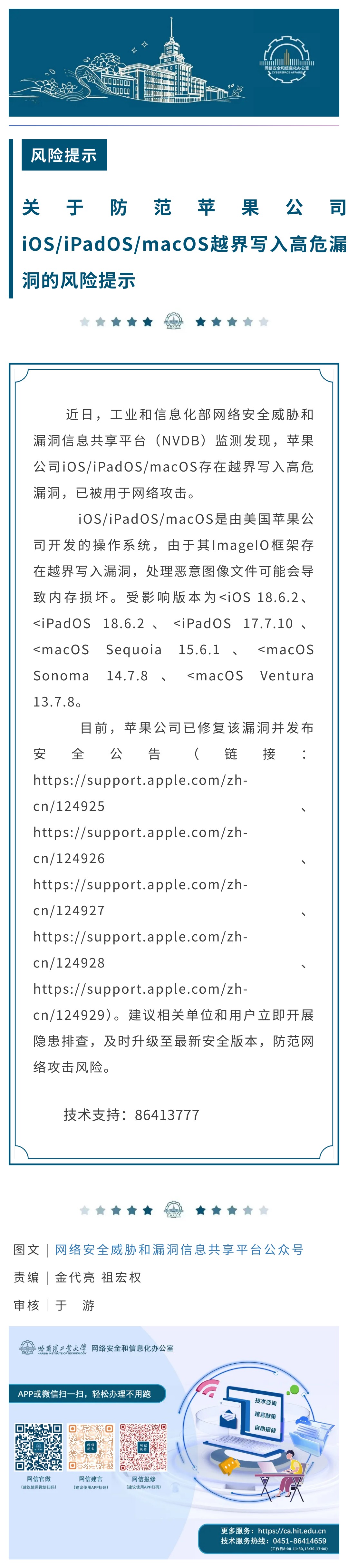 关于防范苹果公司iOS/iPadOS/macOS越界写入高危漏洞的风险提示