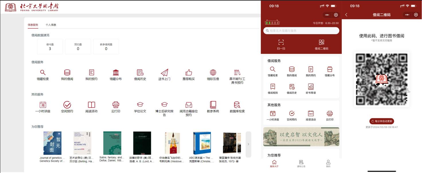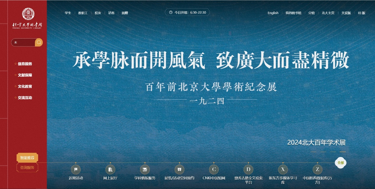 随着信息技术的发展,北京大学图书馆资源体系已经由纸质文献资源拓展至特色馆藏(特藏)资源、电子资源(数字资源)、数据资源、开放获取资源等,形成了多元融合的资源服务体系。同时北京大学图书馆创新服务模式,陆续推出了交融式数字图书馆信息门户、一站式读者服务生态、馆藏数据检索系统、数字教学参考资料系统、图书馆荐购系统、闭架叫号系统等线上服务平台,不断打造便捷化、个性化、智慧化服务生态。