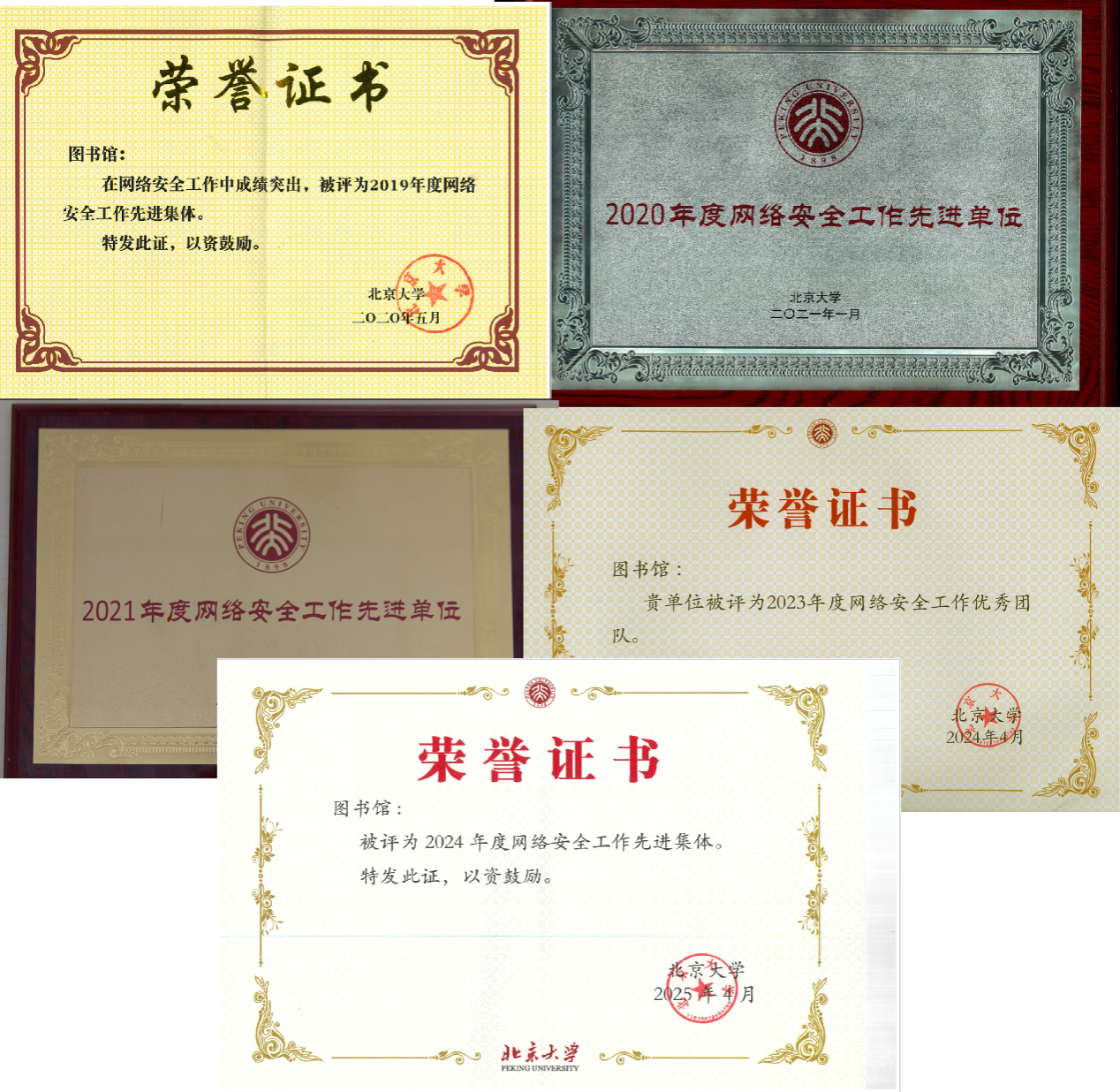 北京大学图书馆先后获得“2019年北京大学网络安全先进集体”“2020年北京大学网络安全先进单位”“2021年北京大学网络安全先进单位”“2023年度网络安全工作优秀团队”“2024年北京大学网络安全先进集体”荣誉称号,杜晓峰、张乃帅、张元俊、赵静茹、陈飞先后获得“北京大学网络安全先进个人”称号。