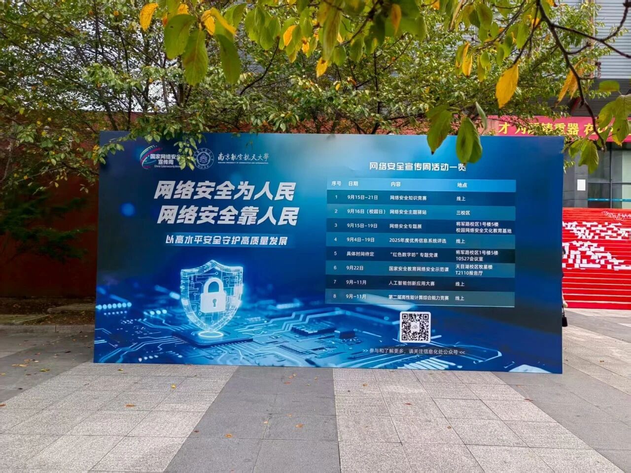 为响应2025年国家网络安全宣传周号召,9月15日至21日,南京航空航天大学举办2025年度网络安全宣传周系列活动。本次活动围绕“网络安全为人民,网络安全靠人民——以高水平安全守护高质量发展”主题,其中9月16日为校园日。南京航空航天大学信息化处积极筹备网络安全系列活动,包括三校区“网络安全主题驿站”、网络安全知识竞赛、网络安全文化教育基地专题展、专题党课等活动,并制作各类线上线下宣传材料在三校区各地投放,旨在帮助各师生提升网络安全素养与安全防护能力。