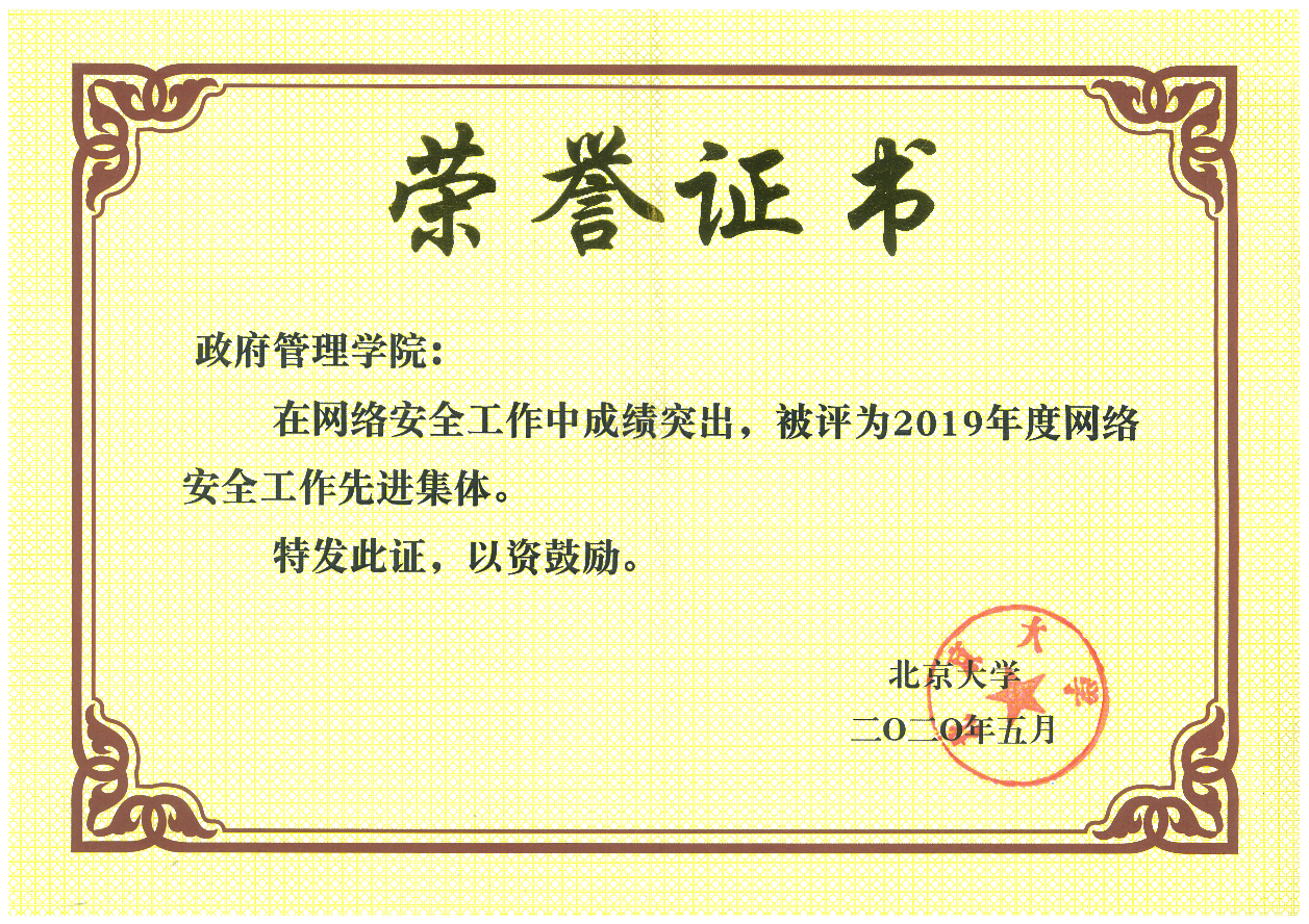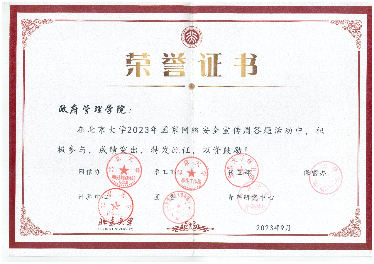 耕耘不负韶华,荣誉见证实力。学院凭借扎实的工作基础和创新的管理实践,连续多年荣获“北京大学网络安全工作先进集体”“北京大学网络安全先进单位”荣誉,连续多年积极参与国家网络安全宣传周相关活动,并自行开展各种特色活动,成绩突出。