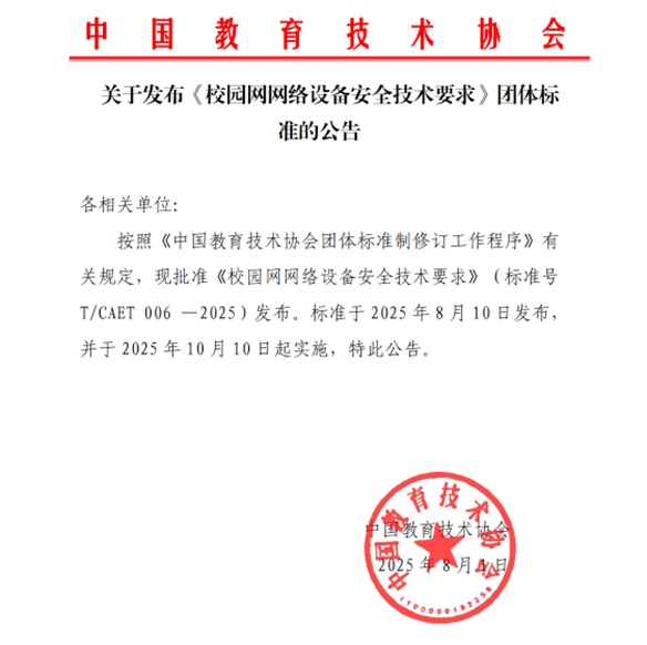 由教育部教育管理信息中心指导,中国教育技术协会立项,浙江大学担任编制组组长,国内众多知名高校及教育机构、中小学、企业共同编制完成的《校园网网络设备安全技术要求》正式发布并实施。这是国内教育行业首个网络设备安全技术要求团体标准。