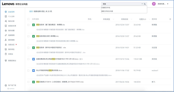 高级搜索: 如果用户想要更加精确的搜索一个文件,可以在搜索框的尾部点击下拉按钮,弹出高级搜索的界面,在此界面可以自定义配置搜索的各种条件。如:“更新者”、“大小”、“时间”、“类型”、“包含文件/文件夹的备注”、“包含标签”、“包含文件内容”、“关键词模糊匹配”“全盘目录搜索”。